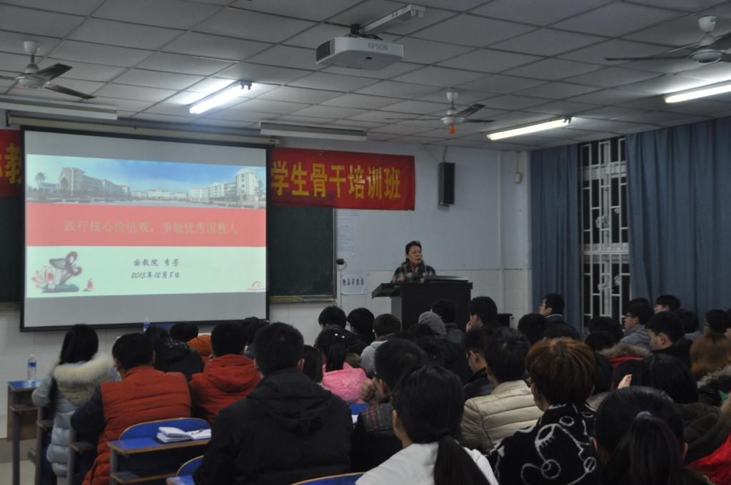 2015年12月8日晚,米兰milan官方网站“青马工程”培训第四讲在E102教室开展,米兰milan官方网站党总支书记李芳老师作了题为“践行核心价值观,争做优秀国教人”的讲座。