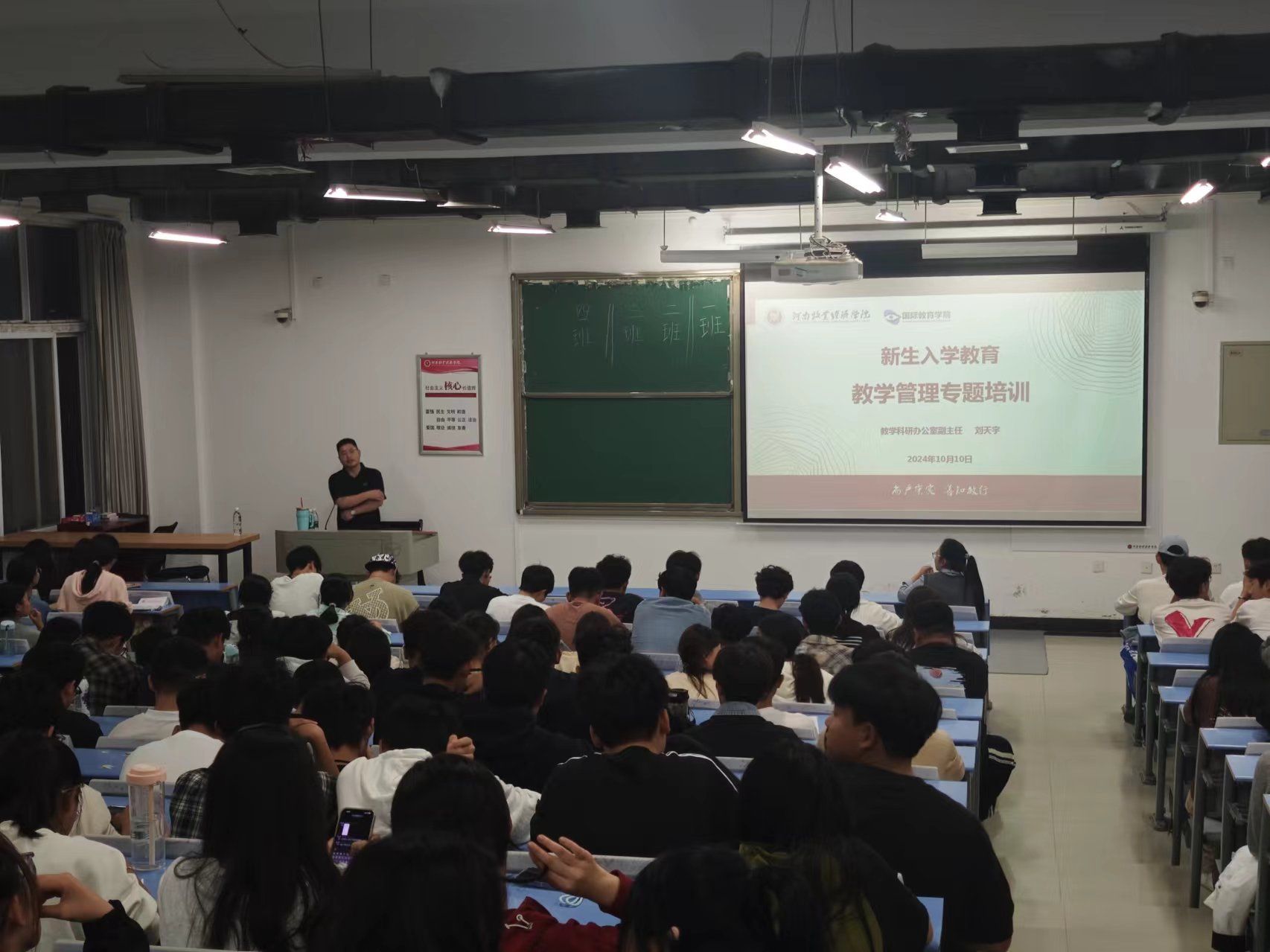 为引导学生熟悉学校教学运行规律,科学制定学业生涯规划,10月10日下午和11日晚上,米兰milan官方网站在英才校区学术报告厅和龙子湖校区1号教学楼301举行了2024级新生入学教育之教学管理专题培训。本次培训由学院教学科研办公室副主任刘天宇主讲,2024级全体学生参加学习。