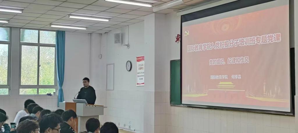 何季霖从“党的组织架构”、“党的组织制度”、“党的纪律和纪律处分”、“对青年大学生的要求”四个方面进行了详细讲解。首先,他通过观看视频和举例子的方式详细介绍了党的组织架构,指出民主集中制是党的根本组织制度和领导制度,坚持和健全民主集中制,是马克思主义政党同其他政党的一个根本区别。随后,他详细讲述了党的六大纪律、五种纪律处分和党员廉洁自律规范等内容,重点介绍了党的十八大以来党的作风建设的成效和经验。他指出作为入党积极分子,要在入党之初就了解党的各方面纪律要求,并时刻以党的纪律严格要求自己,做到“讲规矩,守纪律”;希望所有同学要通过此次培训学习,能够做到思想上旗帜鲜明、学习上守正创新、工作上模范带头、生活上严于律己;能够在学习、工作和生活中做到惟其磨砺、始得玉成。
