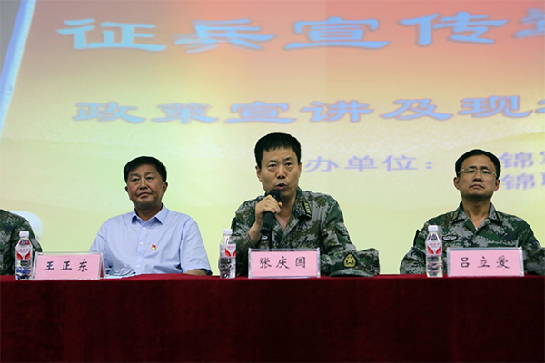 会议首先由盘锦市委常委、军分区司令员张庆国进行动员讲话。张司令员表示:非常高兴来到盘职院,想和大学生面对面就征兵政策和大学生的疑问进行一下交流,了解大学生征兵工作中的问题。他指出,国家对国防建设、军队建设越来越重视,尤其是党的十八大以来,习近平主席对军队建设提出了更高的要求,为提高部队人才队伍建设,需要更多的大学生投身军营,报效国家。张司令员还强调,盘锦军分区将与盘锦市政府沟通,与盘锦市各企业交流,出台更好的政策,为应征入伍大学生解决后顾之忧。