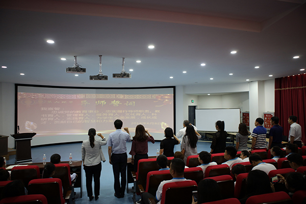 拜师仪式是整个启动仪式上最重要的环节。旅游管理系从主任、书记到专业教师,全员参与。按照寝室抽签已经分好了组,每人带三个、五个、八个学生不等。每组学生依次排成一列,正装出席,面对导师端庄站立,深深鞠躬,导师还礼。双方表情肃穆庄重且带着深深的情感,都充满了一同奋战彼此成长的决心。韩怡老师因病没有到达现场,她送上自己的期许,她说:“虽然我们本就具有师生之谊,但自此礼之后,我们就有了师承关系,我们将更加亲密。这意味着,我要更加严于律己,要对你们负责,毫无保留,授之殷殷。你们也要克尽学生本分,竭力而学。”这种荣辱一体的感情在主持人话筒下,萦绕在整个会议室上方,久久停留。
