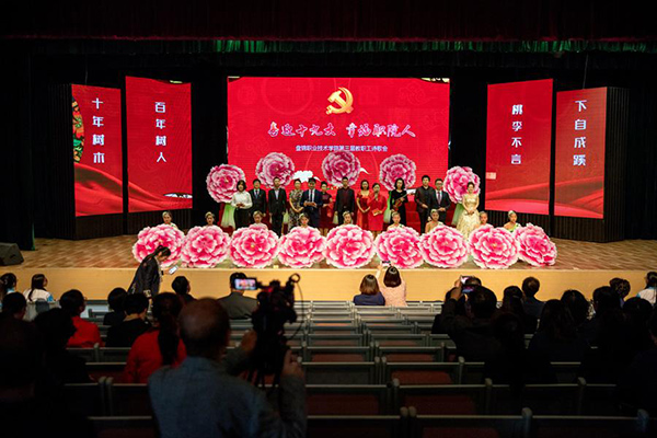 10月13日下午beat365英国官方网站工会在学院文化中心举办了“喜迎十九大 幸福职院人”暨第三届教职工诗歌朗诵会活动,学院领导班子成员,全体教职工以及600余名学生代表共同观看了本次演出。