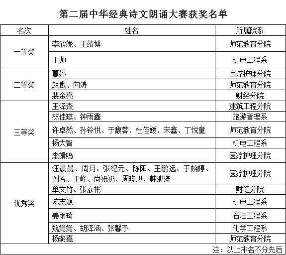 本次朗诵大赛是我院举办的第二届中华经典诗文朗诵比赛,通过朗诵经典诗文,加深了我院青年学生对中华优秀传统文化的了解和热爱,增强了我院青年学生继承和弘扬中华优秀传统文化的自觉性,并在朗诵中品味经典、净化心灵、提升自我,提高思想道德水平,塑造属于时代、属于自我的精彩人生。