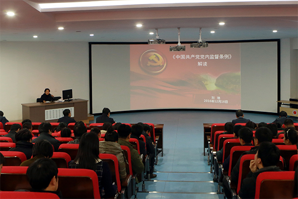 学习贯彻党的十八届六中全会精神,根据学院党委的统一安排,学院纪委书记党课《中国共产党党内监督条例》解读于12月16日下午1点30分在学院博远楼103(辽海盘职院大讲堂)举行。学院班子成员、学院中层干部和机关全体党员参加党课学习。