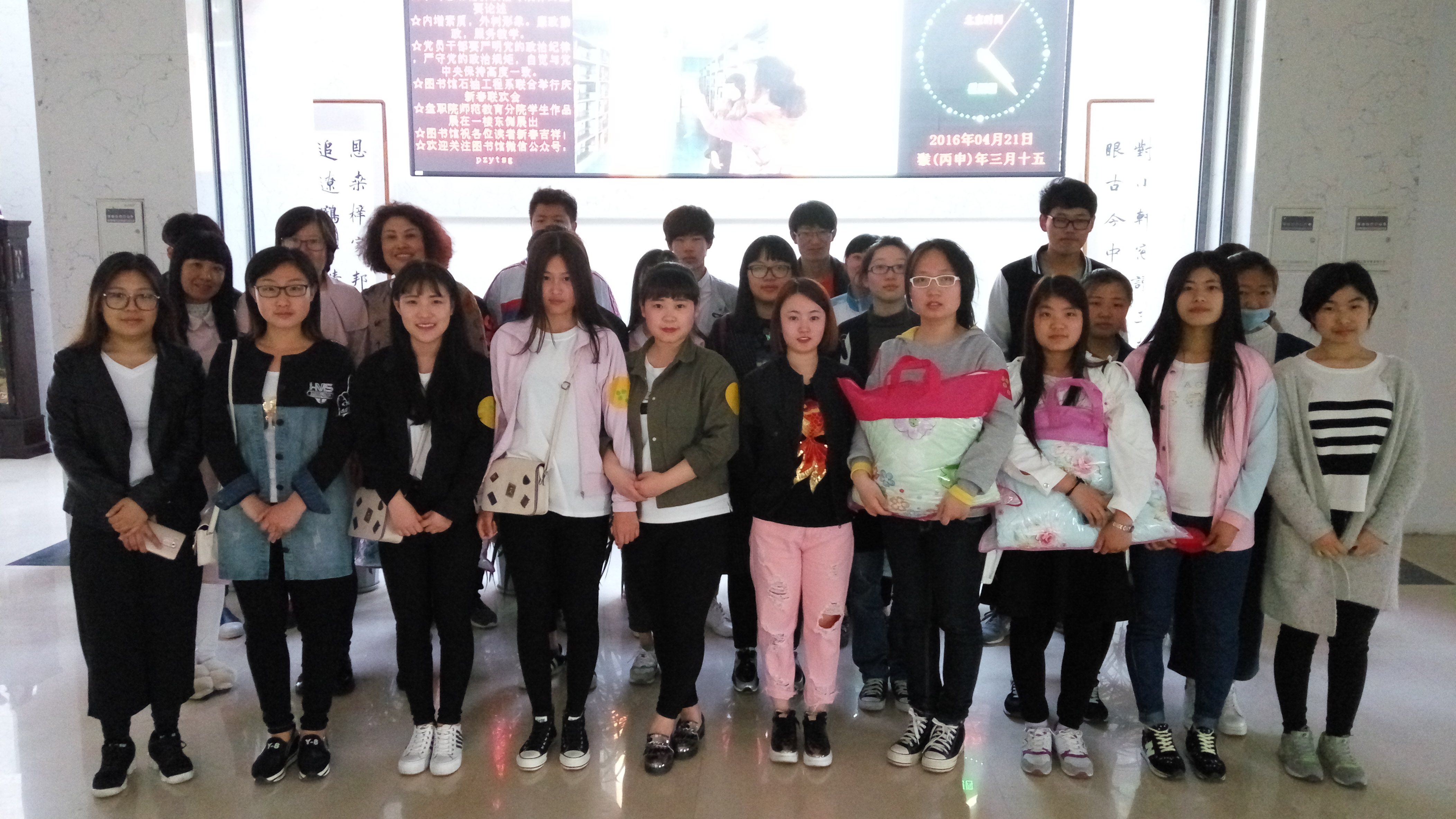 4月19日下午2点,图书馆读书者协会在多媒体教室举办了图书义务管理员“辞旧纳新”文艺晚会。管理员们通过精彩分呈的才艺表演,抒发了对图书馆的眷恋之情与感激之意,增进了同学们之间的感情,丰富了校园文化生活,为新老义务管理员的交接工作做好了顺利铺垫。活动收到了良好的效果。