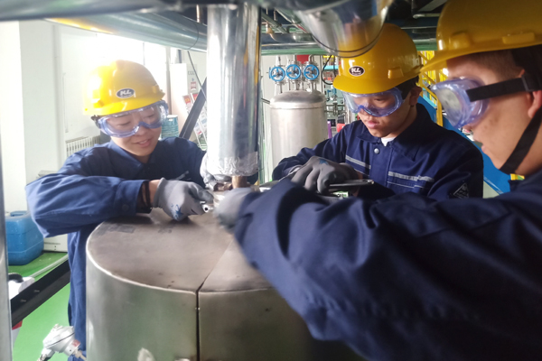 学院化工生产实训中心燃料油常压蒸馏装置由于法兰垫片老化,严重漏液,急需更换密封垫片。吴春丽老师跟设备厂家沟通后,厂家只能邮寄密封垫片,不能派工程师前来更换。面对不可耽搁的教学工作,刘洪宇老师和吴春丽老师带领17级中德化工班赵洪琪、李建行、王忠瑞等学生利用课余时间更换密封垫片。在维修过程中,老师和同学们强忍着设备中的物料散发的刺鼻气味,将防护眼镜和手套配戴整齐,积极发扬不怕脏、不怕累的化工精神,两个多小时后,完成了所有老化垫片的更换,以保证教学工作的顺利进行。