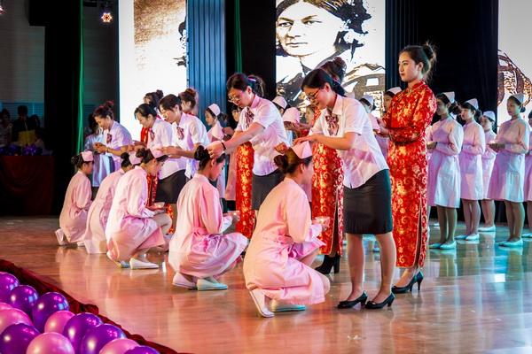 本次庆祝活动共分为测量血压,血糖等义务活动、授帽仪式、“天使风采”文艺演出等三大部分。测量血压、血糖等义务活动于5月12日中午在我院的第一食堂和教工食堂进行,由医疗护理分院的部分老师和同学们身着整洁的护士服,手拿测试仪器和记录单为部分师生进行血压、血糖及身高体重等项目的测定,并热心的对同学们进行了健康知识的宣传和讲解。一群衣着整洁的白衣天使,像一朵朵竞相开放的花儿,成为了校园内一道亮丽的风景线。