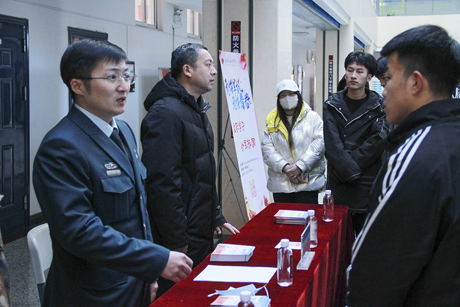陈平海处长和王俊杰副处长就学生关心的学业、专升本等问题与学生面对面进行解答、交流,并邀请学生进入学校征兵服务群,建立入伍意愿数据库,作为宣传、发动、培养重点对象全程关注,随时解疑答惑。