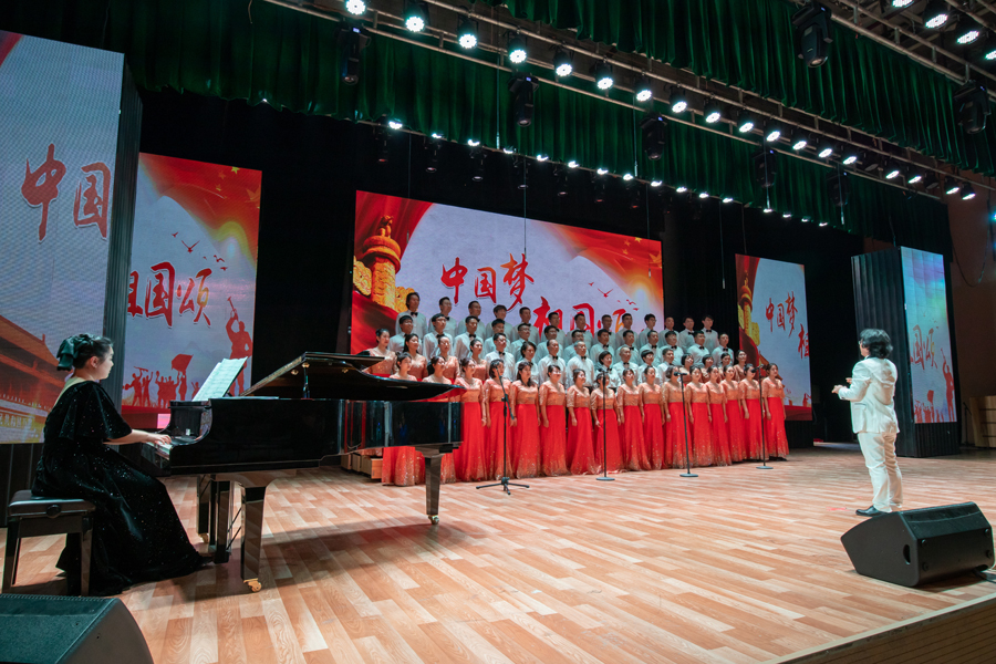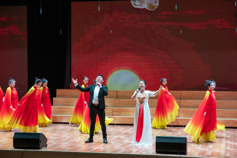 汇演以美轮美奂的歌伴舞《领航》拉开帷幕,欢快的节奏激情的歌声瞬间燃爆全场。整场演出形式丰富、精彩不断、高潮迭起,赢得台下阵阵掌声。歌伴舞、诗朗诵、舞蹈、器乐合奏、情景剧、独唱、小合唱、大合唱等歌舞诗剧饱含着澎湃的爱国热情和强烈的民族自豪感。蔚为壮观的大合唱《走向复兴》《歌唱祖国》为本场演出划上了圆满的句号,台上台下齐声欢唱,连成一片歌声的海洋,共同表达着对祖国母亲深沉的爱和作为中国人的自豪感。