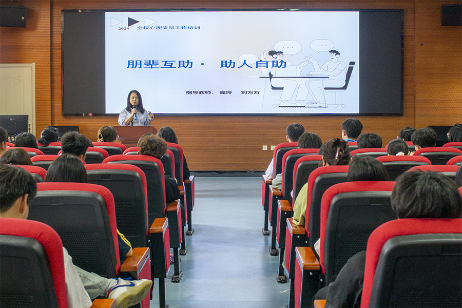 本次培训分为两大部分。首先,思政教研部心理教研室主任高玲围绕心理委员的工作职责、角色、工作原则、如何自助和助人等内容做了辅导讲座。随后,心理健康教师刘方方从心理问题和危机干预两个方面,重点向心理委员们讲授心理健康的标准、大学生常见心理问题及应对策略、对高危人群的识别及干预等内容。