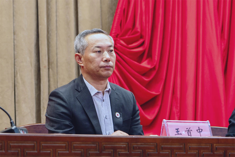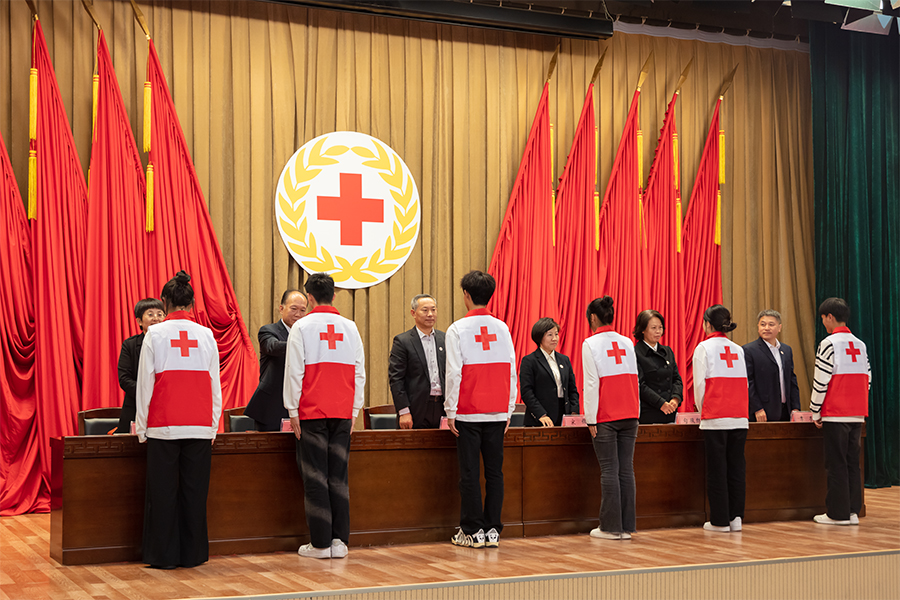 校红十字会常务理事为新会员代表佩戴红十字会徽章。这象征着新会员正式加入红十字会大家庭,每一枚徽章都承载着荣誉与使命,传递着人道主义精神的接力棒。