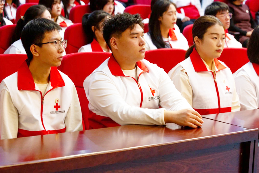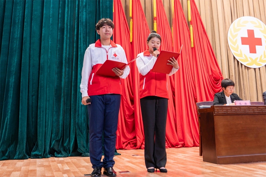 在入会宣誓仪式环节,由学校学生会主席团成员、校红十字会学生理事张一蒙同学领誓,新会员师生代表庄严宣誓加入红十字会。一句句誓言,是对红十字精神的忠诚表达,会员们将永远恪守誓言,不忘初心、牢记使命,以实际行动践行红十字精神,为中国式现代化全面推进强国建设、民族复兴伟业和人类和平与进步事业贡献力量。