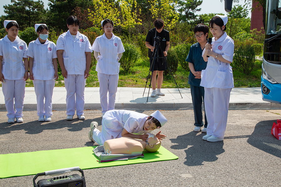 医疗护理学院师生代表从火灾烫伤/烧伤、窒息急救、外伤止血等方面为现场人员进行讲解、演示。