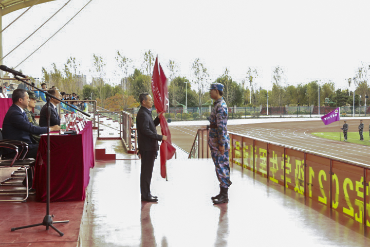 学校党委书记、校长王首中向2021级学生军训营授营旗。2021级学生军训正式开始。