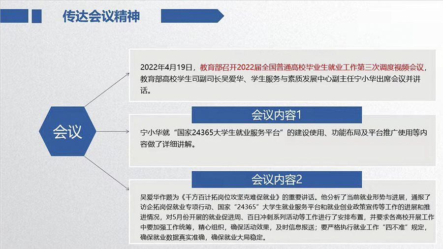 会上,王新处长首先就4月19日教育部2022届全国普通高校毕业生就业工作第三次调度视频会议精神进行传达,并对beat365官网目前就业率统计、访企拓岗促就业专项行动、就业创业政策宣传等相关就业工作开展情况加以说明。