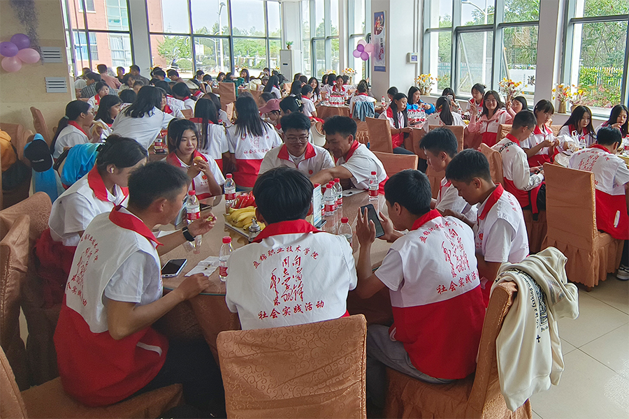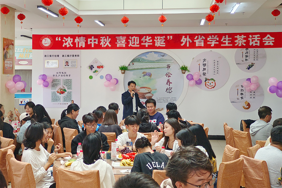 返校后,在学生工作处的精心筹备下,参加活动的全体师生于beat365官网教工食堂举办了“浓情中秋 喜迎华诞”外省学生茶话会。餐桌上满盘的瓜果和精美的月饼,烘托出祥和的节日气氛,让每名省外留校学生在校园里体会到家的温馨与幸福。师生们一边分享节日美食,一边用歌声和话语表达自己的幸福心情,分享本次社会实践活动的收获与感受。
