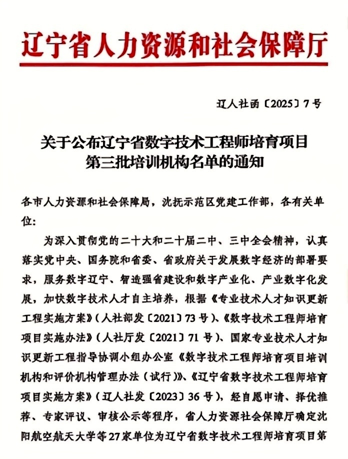 2025年1月8日,省人力资源和社会保障厅公布辽宁省数字技术工程师培育项目第三批培训机构名单,我院获得“物联网工程技术人员”“工业互联网工程技术人员”“人工智能工程技术人员”“大数据工程技术人员”“云计算工程技术人员”“数字化管理师”六个职业方向的数字技术工程师培训资质。