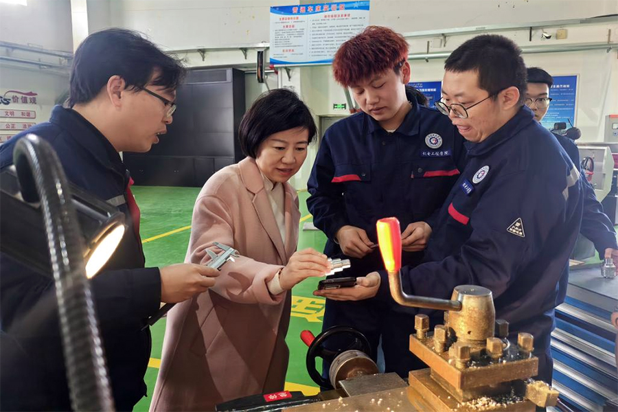 随后,宋锦校长一行前往工科实训中心,实地考察化学工程学院金工实训课程的开展情况,并对机电工程学院机械制造及自动化专业及中德班课堂的教学情况进行检查。在检查过程中,宋锦校长仔细查看教学设施运行状态,询问学生学习进展,并与现场师生亲切交谈,了解他们在学习与教学中遇到的困难与需求。针对检查中发现的问题,宋锦校长现场提出整改要求,并要求相关二级学院立即跟进落实。