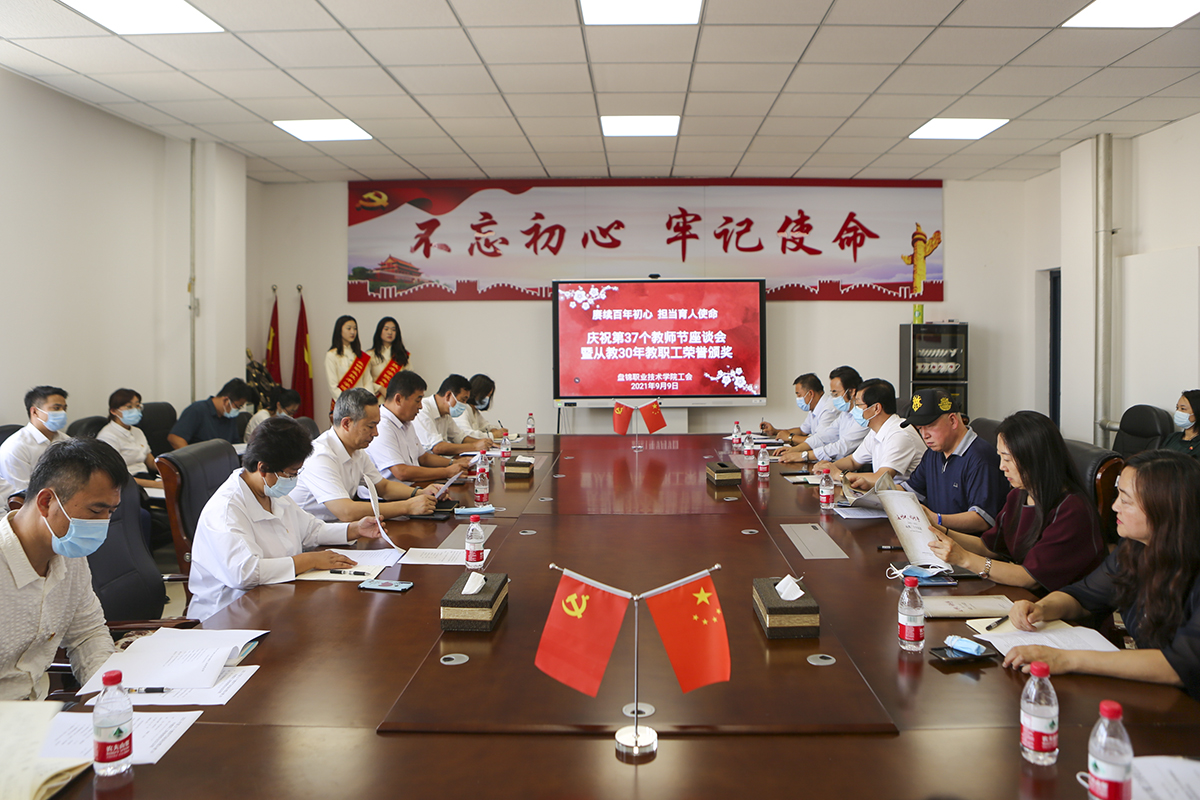 9月9日下午,在第37个教师节来临之际,beat365英国官方网站工会组织召开以“赓续百年初心 担当育人使命”为主题的第37个教师节座谈暨从教30年教职工荣誉颁奖会议。学校党委书记、校长王首中,工会主席刘艳,八学院分工会主席、从教满30年教职工代表、优秀教职工代表、辅导员代表、新进教师代表、省赛获奖代表等同志参加会议。