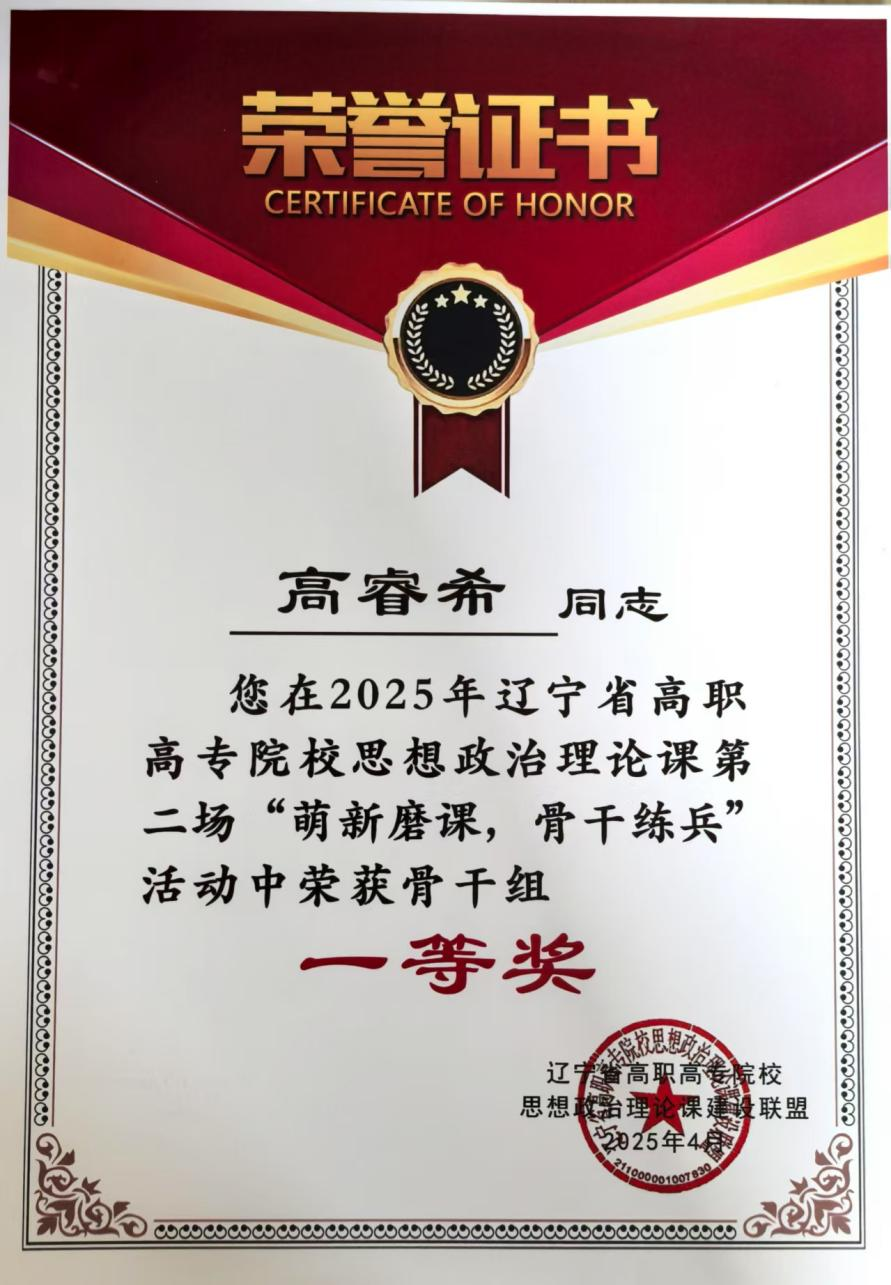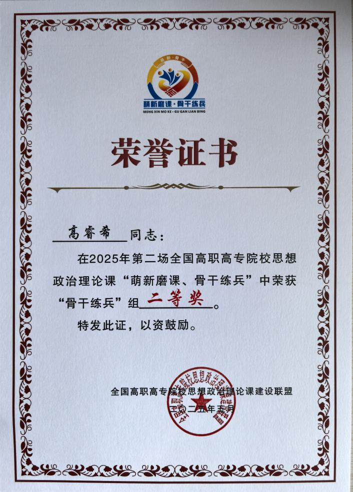 近日,2025年第二场全国高职高专院校思想政治理论课“萌新磨课、骨干练兵”教学展示活动落下帷幕。beat365官网教师高睿希经过辽宁省比赛、全国决赛,荣获辽宁省“骨干练兵组”一等奖、全国“骨干练兵组”二等奖。