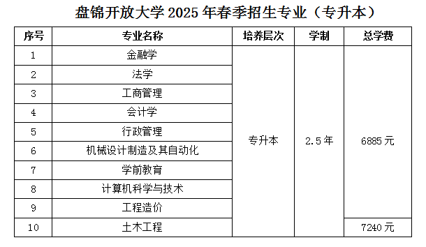 盘锦开放大学2025年春季招生专业(高起专)