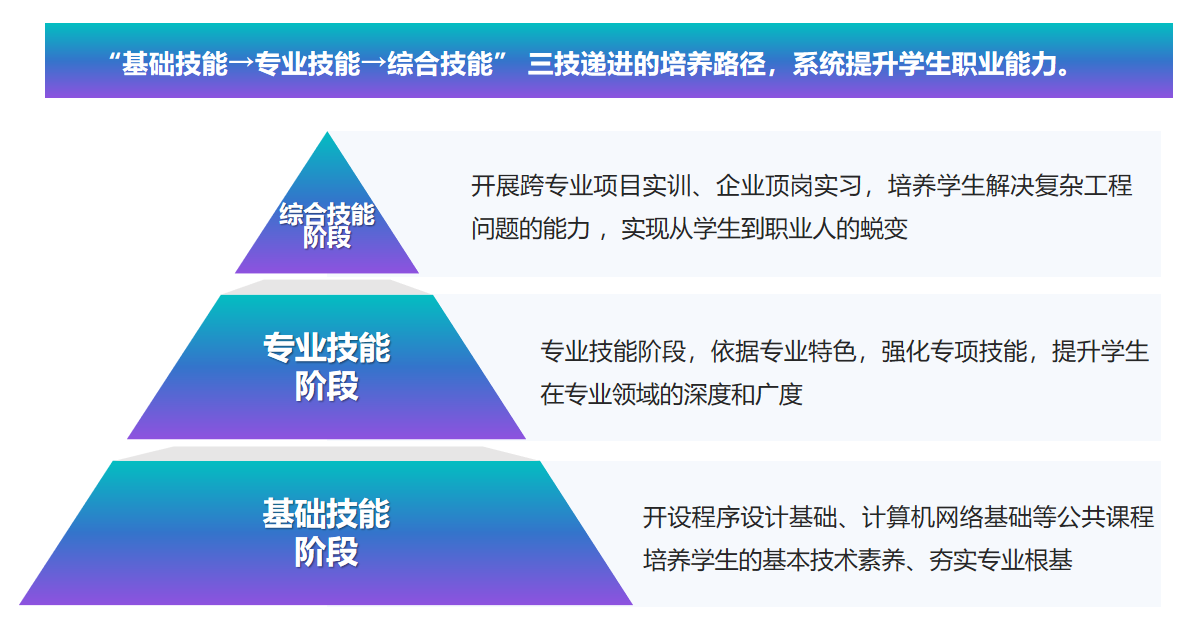在基础技能阶段,开设程序设计基础、计算机网络基础、计算机组装与维护、电工电子技术等课程,夯实学生计算机软硬件知识、编程思维和网络基础,培养严谨细致的职业习惯。在专业技能阶段,结合专业方向模块,开设面向对象程序设计、Web前端开发技术、数据库技术、系统部署与运维、数据分析与可视化等专业课程,强化岗位必需的专项技术能力。在综合技能阶段,通过跨专业项目实训、企业真实项目开发、顶岗实习等实践环节,提升学生的软件项目管理、系统集成、数据分析、运维管理等综合能力,培养解决复杂工程问题、团队协作和创新实践的能力,实现专业能力与岗位胜任力的有效衔接。