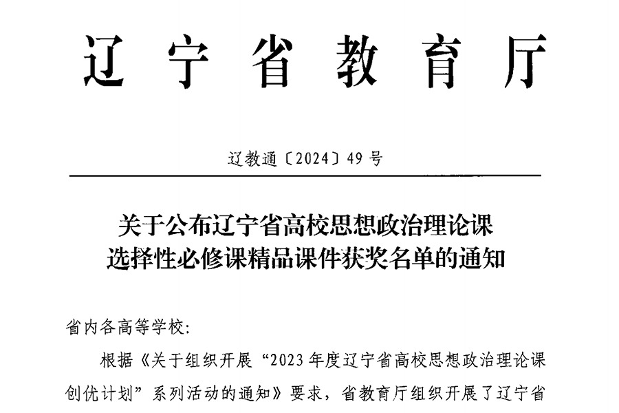 近日,辽宁省教育厅公布辽宁省高校思想政治理论课选择性必修课精品课件评选结果,beat365官网共有两个作品获奖。根据《关于组织开展“2023年度辽宁省高校思想政治理论课创优计划”系列活动...