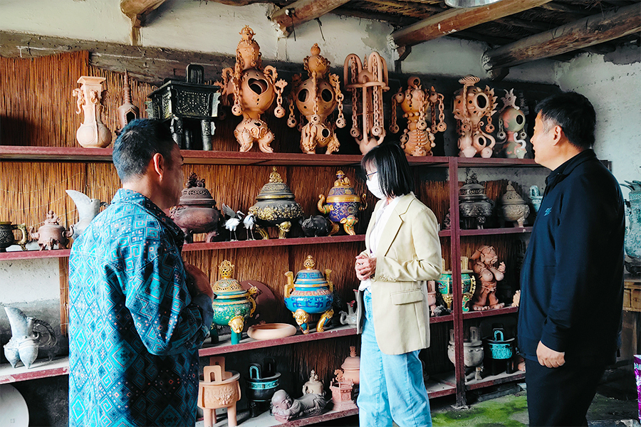 为传承中华优秀传统文化,加强非物质文化遗产保护和传承,2024年5月30日图书馆书记孙卓、馆长阙英伟带领非遗小组业务骨干前往市级非遗项目小亮沟苇编、辽河口海泥土陶实地调研。调研...